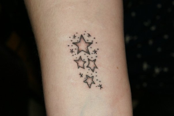 This is mine - the stars look wonky as I had my arm stretched out, but when it's relaxed it's not so bad, although it wasn't the best job in the world! I wish I'd gone to a couple of tattoo artists before hand.