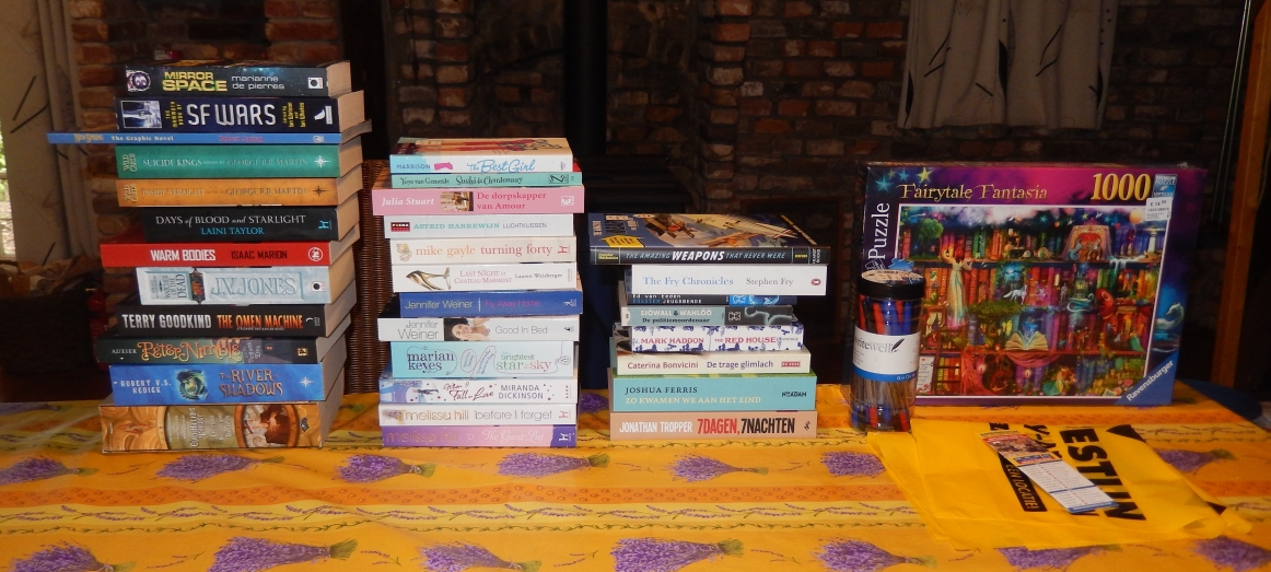 Athena Posted May 8, 2015 Author Posted May 8, 2015 I went to the book fair yesterday, since it was pretty close by this time. I hadn't been in February because I was too ill or too tired to go. It was great to go now though . I really tried to watch for how much things cost, and my most expensive book was €3,99 (unless you count the one book my boyfriend got, which was €7,99). We did also buy a puzzle, that was the most expensive 'item', we got a 20% discount because of the voucher we had. I also bought some pens. Below follows a photo and a list of the books. The book my boyfriend bought: Gregory Benford - The Amazing Weapons That Never Were - Robots, Flying Tanks & Other Machines of War These ones I bought: Stephen Fry - Memoir 2: The Fry Chronicles (I like the man, and I've been meaning to read some of his writings. Several people have recommended his memoirs to me) Ed van Eeden - District Noord 1: Dossier Jeugdbende (a nice short read-a-thon detective) Maj Sjöwall and Per Wahlöö - Sjöwall & Wahlöö 9: De Politiemoordenaar (Polismördaren) (I didn't have this one yet) Mark Haddon - The Red House (this was on my wishlist for a while, because I really enjoyed The Curious Incident of the Dog in the Night-Time) Caterina Bonvicini - De Trage Glimlach (Il Sorriso Lento) (this sounded good and was pretty cheap) Joshua Ferris - Zo Kwamen We Aan Het Eind (Then We Came to the End) (this sounded good and was cheap) Jonathan Tropper - 7 Dagen, 7 Nachten (This Is Where I Leave You) (I believe Frankie / Sari recommended this to me.) Emma Harrison - The Best Girl: If You're Going for the Perfect Guy, You Want to Be... (this looked cute and it was cheap, a nice short read-a-thon read) Yoyo van Gemerde - Sushi & Chardonnay (another suited for a read-a-thon) Julia Stuart - De Dorpskapper van Amour (The Matchmaker of Périgord) (this sounded nice) Astrid Harrewijn - Luchtkussen: In Het Gooi Lijken Dingen Soms Mooier Dan Ze Zijn... (I have two other books by the author, it sounded nice) Mike Gayle - Turning Thirty 2: Turning Forty: Laughter. Tears. Beers... and Cake (I have book 1 in this series on my TBR, in Dutch. I was recommended this author by someone.) Lauren Weisberger - Last Night At Chateau Marmont (I liked The Devil Wears Prada by the same author, I also own its sequel but I haven't read that one yet). Jennifer Weiner - Fly Away Home: One Mother. Two Daughters. Three Life-changing Decisions. (I read other book(s) by the author and liked those) Jennifer Weiner - Cannie Shapiro 1: Good in Bed (see one above, plus I have book 2 of this series on my shelf, unread). Marian Keyes - The Brightest Star in the Sky (I own one other unread book by the author, and I really liked the cover of this book). Miranda Dickinson - When I Fall in Love (this author came recommended to me by someone) Melissa Hill - Before I Forget: If You Could Hold On To Just One Memory, What Would It Be? (I really liked some other books by the author) Melissa Hill - Lakeview 5: The Guest List (I didn't know this was part of a series, that's just what GoodReads tells me. See above, I really liked some other books by the author). Marianne De Pierres - The Sentients of Orion 3: Mirror Space (I own book 2, unread.) Ian Watson and Ian Whates - The Mammoth Book Of SF Wars (short science-fiction stories) Robert Jordan, Chuck Dixon, Mike Miller and Harvey Tolibao - The Wheel of Time Graphic Novels 0: New Spring (I was super excited to find this. I own the graphic novel of book 1 digitally, but I much prefer to read a paperbook, so I was very excited to have found it and for such a low price. I didn't know they made more of the series into a graphic novel. This is the prequel. The book fair had more interesting graphic novels but they were usually more pricey so I didn't buy them.) George R. R. Martin - Wild Cards 18: Inside Straight (Initially I didn't put this one in my basket, but then I saw there was a second book of the series. I have heard people talk about them.) George R. R. Martin - Wild Cards 20: Suicide Kings (see above.) Laini Taylor - Daughter of Smoke and Bone 2: Days of Blood and Starlight (I own book 1, unread.) Isaac Marion - Warm Bodies 1: Warm Bodies (Dutch) (I've heard good things about this book). J. V. Jones - Sword Of Shadows 4: Watcher of the Dead (I own other books by the author, including one in this series. They can be hard to find so for a low price I was swayed.) Terry Goodkind - The Sword of Truth 12: The Omen Machine (I was happy to have found this, and for a low price too. I own all the other books in the series in English, after giving my brother my Dutch versions (other than this book since I didn't own it in Dutch nor English)) Jonathan Auxier - Peter Nimble 1: Peter Nimble And His Fantastic Eyes (this book seemed interesting. When I got home I checked out the author's website as to find out his nationality. Have a look: Website, click on the About link and be surprised.. if that humour is also in the book, I'll love it.) Paul B. Thompson, Tonya C. Cook and Douglas Niles - Dragonlance: The Elven Nations Trilogy 1-3: Firstborn, The Kinslayer Wars, The Qualinesti (I actually already own book 1 in this omnibus, but it was a low price for the omnibus so I went for it). Also, Michelle was so kind to sent me : Peter F. Hamilton - Commonwealth: Chronicle of the Fallers 1: The Abyss Beyond Dreams (Signed Proof Copy) Quote