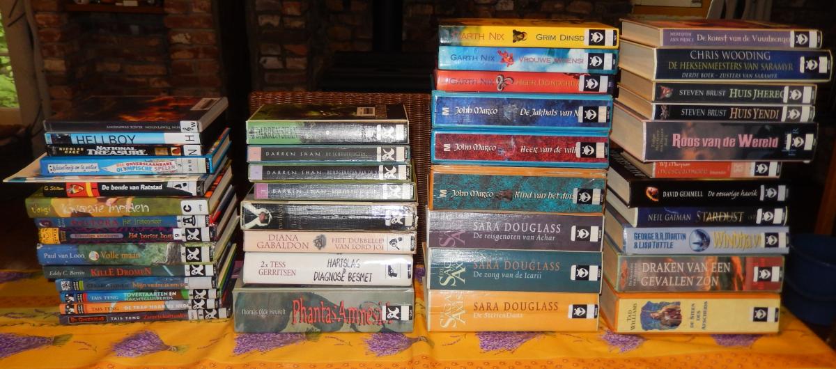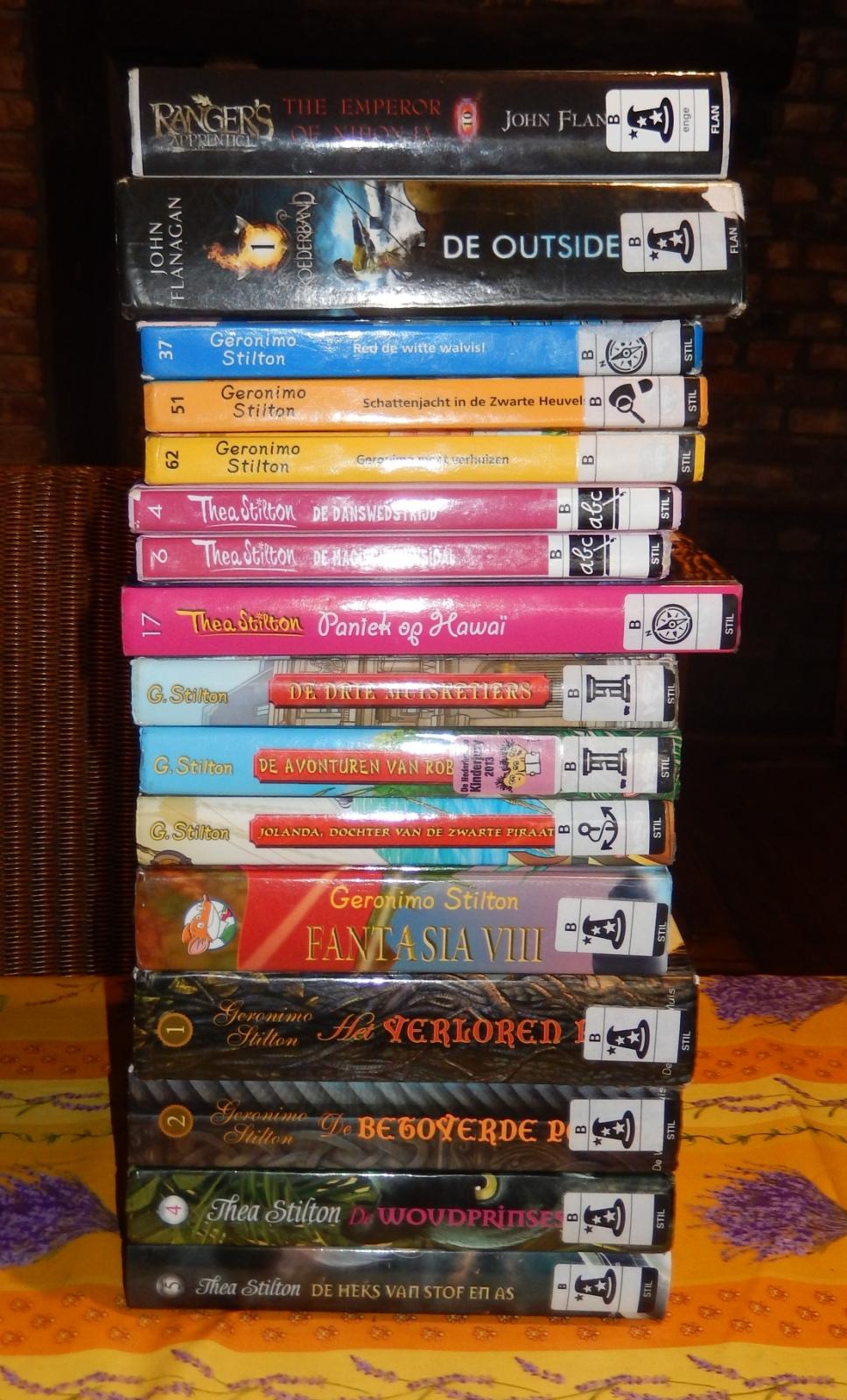 Athena Posted June 22, 2015 Author Posted June 22, 2015 I already had these library loans: John Flanagan - Broederband 2: De Indringers (Brotherband 2: The Invaders) John Flanagan - Broederband 3: De Jagers (Brotherband 3: The Hunters) John Flanagan - Broederband 4: De Slaven van Socorro (Brotherband 4: Slaves of Socorro New Library Loans: John Flanagan - Ranger's Apprentice 10: The Emperor of Nihon-Ja (yay, I finally found book 10. Now all that's left are books 2 and 6. Maybe next time!) John Flanagan - Broederband 1: De Outsiders (Brotherband 1: The Outcasts) (I thought on the off-chance that they have book 1, I'll have a look.. and they did!) Geronimo Stilton - Geronimo Stilton 37: Red de Witte Walvis! (Salviamo La Balena Bianca!) (then, my boyfriend was flicking through a book and because I was a bit impatient, I couldn't help myself and had a look at the Stilton stuff.. and they had more of them than I've ever seen them have before! And this is a fraction of all the Stilton books that've been published, or that the library owns.) Geronimo Stilton - Geronimo Stilton 51: Schattenjacht in de Zwarte Heuvels (Il Tesoro Delle Colline Nere) Geronimo Stilton - Geronimo Stilton 62: Geronimo Moet Verhuizen! (Geronimo Cerca Casa) Thea Stilton - Het Leven op Topford 4: De Danswedstrijd (Sfida a Ritmo Di Danza!) Thea Stilton - Het Leven op Topford 6: De Magische Muisical (Cinque Amiche Per Un Musical) Thea Stilton - Thea Stilton 17: Paniek op Hawaï (La Leggenda Dei Fiori Di Fuocco) Geronimo Stilton - De Drie Muisketiers (I Tre Moschettieri) Geronimo Stilton - De Avonturen van Robinson Crusoe (Le Avventure di Robinson Crusoe) Geronimo Stilton - Jolanda, Dochter van de Zwarte Piraat (Jolanda, La Figlia Del Corsaro Nero) Geronimo Stilton - Fantasia 8: Fantasia VIII (Ottavo Viaggio Nel Regno Della Fantasia) Geronimo Stilton - De Kronieken van Fantasia 1: Het Verloren Rijk (Cronache Del Regno Della Fantasia 1: Il Reame Perduto) Geronimo Stilton - De Kronieken van Fantasia 2: De Betoverde Poort (Cronache Del Regno Della Fantasia 2: La Porta Incantata) Thea Stilton - Princessen van Fantasia 4: De Woudprinses (Principessa Delle Foreste) Thea Stilton - Heksen van Fantasia 5: De Heks van Stof en As (Strega Della Cenere) New books bought in the library sale: Michael Coleman - Waanzinnig om te Weten: Die Onverslaanbare Olympische Spelen (Flaming Olympics) (I used to read this series when I was a child[/b] Marie-José Balm, Jos van Hest and Marjolein Krijger - N46: Blauw: Mini-Informatie (I had completely forgotten about this series of information booklets until I saw them during the sale. For nostalgia's sake I couldn't help myself.. so I picked one about the colour blue, of the early series and.. see below:) William van den Akker - N195: Voedsel Bewaren: Informatie (... and I also picked one from the later series which has a different design, such nostalgia seeing these books again and now owning them.) Geronimo Stilton - Superhelden 1: De Bende Van Ratstad (I Difensori Di Muskusrat City) (naturally, I had to have this Stilton book that I haven't read yet nor did I own it). Cynthia Voigt - Kwaaie Meiden 1: Kwaaie Meiden (Bad Girls 1: Bad Girls) (again a lot of nostalgia seeing this cover again, I had completely forgot about this book. I had no idea it was part of a series as that information isn't on the Dutch cover and apparently not all of them were translated. I remember I really liked this book when I was a teenager. I also really like some other books by this author). Emily Rodda - Deltora 2: Het Tranenmeer (The Lake of Tears) (I have other books in this series so of course I bought this one) Lemony Snicket - Ellendige Avonturen 8: Het Horror Hospitaal (A Series of Unfortunate Events 8: The Hostile Hospital) (I have other books in this series so I bought this one) Paul van Loon - Dolfje Weerwolfje 2: Volle Maan (my sister always really liked this book. I've never read it as when she was reading it I was in a teenage phase of children's books are too easy for me, but I look forward to reading it now. I love a lot of other books by this author). Eddy C. Bertin - Valentina 6: Kille Dromen (I had no idea this was part of a series, but I own book 3 in the series, also not knowing it was part of a series. I loved book 3, called Overal Vuur, with such a pretty cover too, and I liked other books by this author) Gerard Tonen - Mijn Vader Is Een Sukkel (I don't know this author, I was attracted to it because it's part of a publishing series of which I've read other books.) Tais Teng - Tovertaarten En Nachtgluiperds (I've read and liked several books by this author, and these next two were part of a publishing series) Tais Teng - De Trap Naar de Nederzee (see above + I think I've read this one when I was a child) Tais Teng - De Griezelklas 6: Zwartekattenkwaad (I'm pretty sure I read this when I was a child, it's about a cat and it's horror. This was a series too of which I've read several. I didn't own any of them. I've read various books by the author.) Darren Shan - Demonata 2: Demonenjager (Demon Thief) (I haven't read any books by this author yet, though I own an omnibus, but the author has been recommended to me by several people) Darren Shan - De Wereld van Darren Shan / Cirque du Freak 7: De Schemerjagers (Cirque du Freak 7: Hunters of the Dusk) (see above) Darren Shan - De Wereld van Darren Shan / Cirque du Freak 8: Bondgenoten Van De Nacht (Cirque du Freak 8: Allies of the Night) (see above) Darren Shan - De Wereld van Darren Shan / Cirque du Freak 11: Heer Van Het Duister (Cirque du Freak 11: Lord of the Shadows) (see above) Stephenie Meyer - Twilight 1: Twilight (Dutch) (I own book 4, Breaking Dawn in English, but I didn't own the other three. Now I have book 1. I have already read all four of them, my sister owns them.) Diana Gabaldon - Lord John Grey 1: Het Dubbelleven van Lord John (Lord John and the Private Matter) (I've heard this series is less good than the Outlander series, but at this price