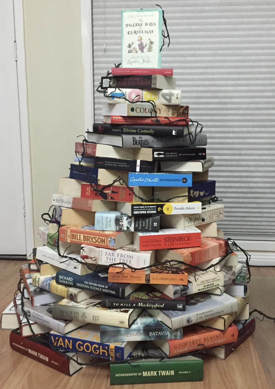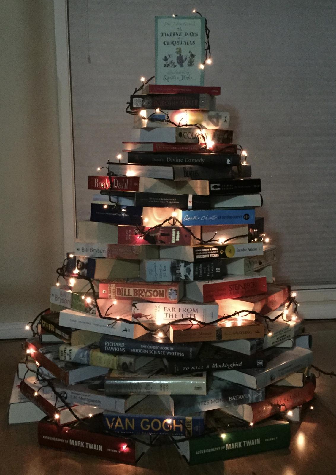 Kylie Posted December 12, 2015 Author Posted December 12, 2015 I finished putting up my Christmas tree today...the first time I've made one out of books. I had to keep undoing sections and redoing them after noticing that one side was leaning at a steeper angle than the other, or that the books were too thin. Using thick books certainly helps—you get the height but in fewer layers. I won't be turning the lights on for more than a few minutes at a time—don't want to risk hurting my books! Quote