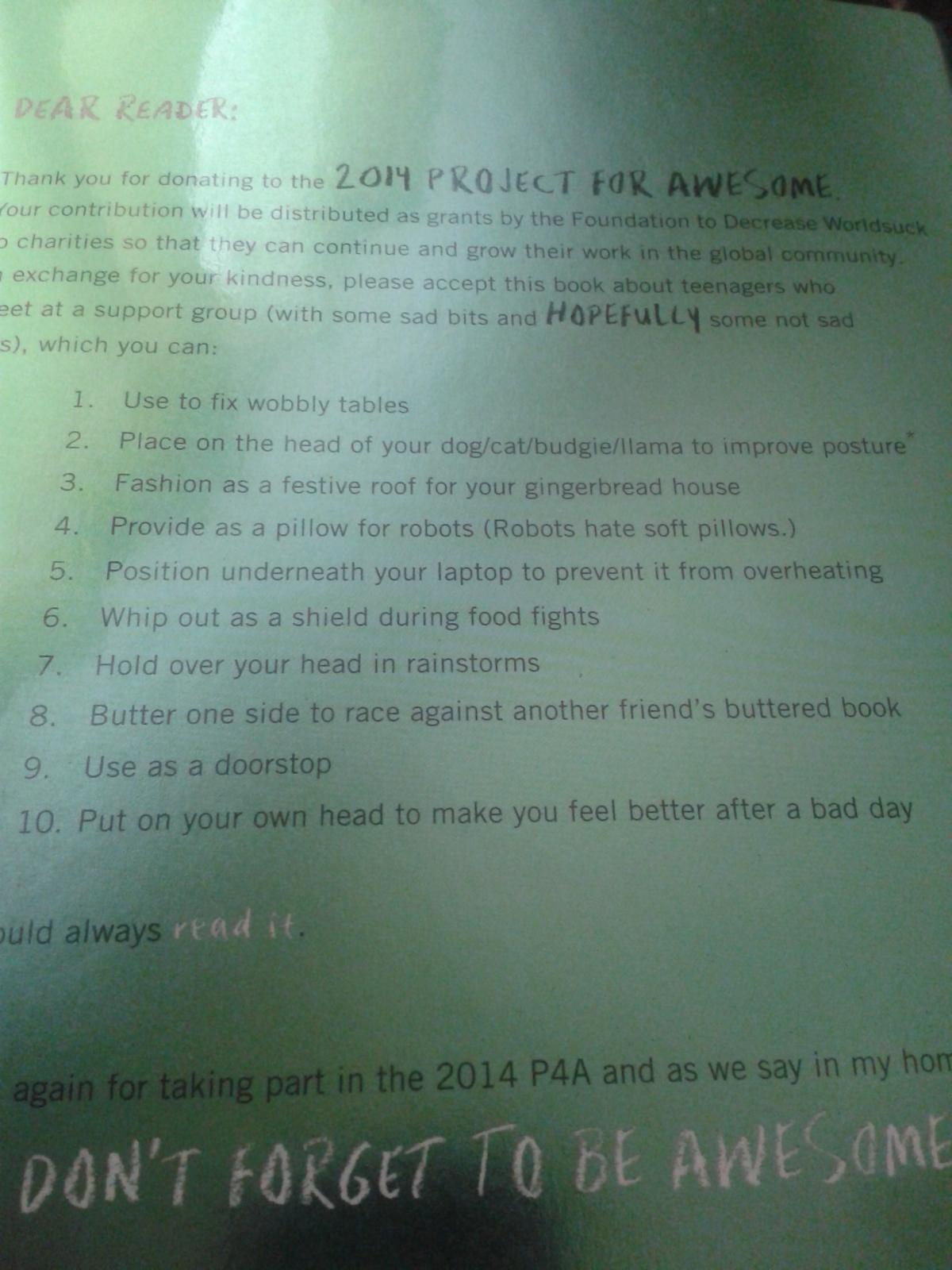 Nollaig Posted March 23, 2015 Author Posted March 23, 2015 (edited) In other news, today my sparkly/shiny green TFIOS hardback arrived! This book is a 'perk' I got for donating to the Vlogbrother's annual fundraiser, the Project For Awesome. (I have another perk, pressed Nerdfighter pennies, on the way soon hopefully!) I already have the world's most unique paperback TFIOS because it's signed and Hank drew all over it, but I love exclusive things like this It comes with a useful list of suggestions on the back of what to do with it! Edited March 23, 2015 by Nollaig Quote