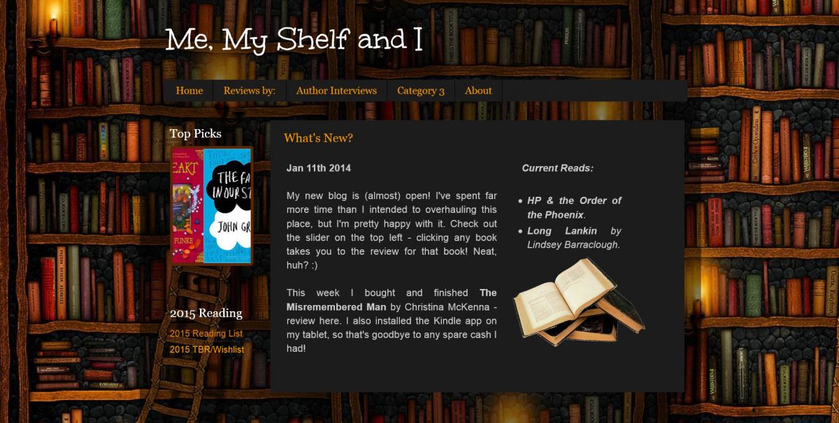 Nollaig Posted January 11, 2015 Author Posted January 11, 2015 (edited) Yes .. I thought the same Claire .. The Order of the Phoenix in particular dragged. I love Stephen's readings of the books .. seriously awesome, his voices are all spot on. Tis true he would have made a good Dumbledore (the shame of the films is that poor Richard died and we had to have two Dumbledores ) Happy Reading in 2015 Noll Hmm I'm not really one for audiobooks, but I might check out one of the HP books read by him, just to hear these voices! And thanks I only read the last two HP books. I'm a bit dubious about reading the others now as I love the films. I tried the first book years ago and couldn't get on with it. I agree her writing leaves a lot to be desired but I think her story-telling and imagination are great. Happy reading in 2015 Noll Yeah, I only resolved to get through them for the sake of adding to my knowledge of the finer details left out of the film, and they've served that purpose very well. Just 150 pages of Phoenix to go, and then I'm onto the last two. They will always only be a supplement to the films, for me, but once I've read em I'm a true Potter fan I spent most of today totally overhauling my book blog, which hadn't been touched since 2013. Think it's starting to look pretty nifty, now. It's a Blogger site, but thanks to Blogger's capacity for custom HTML/CSS and Javascript, my page is now seriously minimalist, with an image slider on the left which links to various reviews, drop down menus at the top for neatly organising all my reviews by author, genre, and rating, and divided columns within posts for minimal widgets and gadgets and things. As indicated by 'Category 3', it's not yet finished, but I'm nearly there! (And yes, I know it's 2015, I screencapped before I changed it XD ) Edited January 11, 2015 by Nollaig Quote